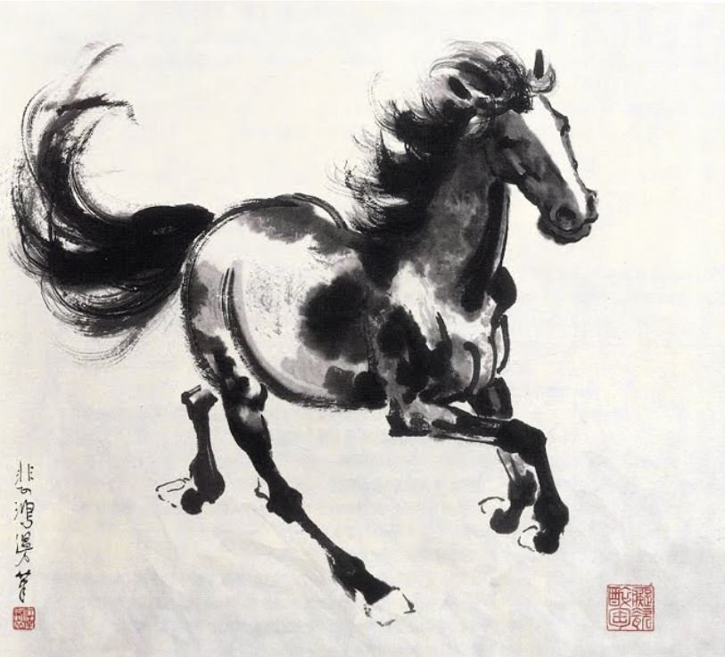 ภาพวาดนี้แตกต่างจากภาพวาดม้าแบบมองด้านข้างแบบดั้งเดิม โดยใช้มุมมองแบบสามในสี่ส่วน วาดด้วยการสาดหมึกอย่างอิสระและชัดเจน รูปร่างที่แข็งแรงและมั่นคงของม้าที่กำลังวิ่ง ขนแผงคอและหางที่พลิ้วไหว และกีบที่ทรงพลัง ดูเหมือนจะพุ่งเข้าหาผู้ชม กระทบสายตาโดดเด่น