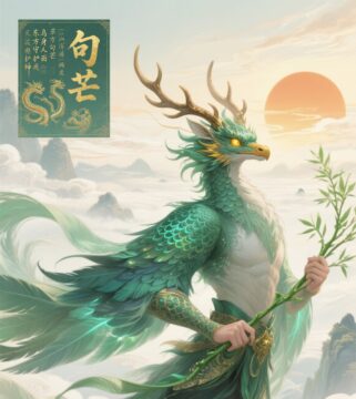 จากคัมภีร์ 海外东经 โกวหมาง เป็นเทพผู้ช่วยของเส้าฮ่าว 少昊 หนึ่งในห้าจักรพรรดิแห่งยุคโบราณ ภาพลักษณ์ของเขานั้นมีร่างกายส่วนบนของเขาเป็นนกที่ปกคลุมด้วยขนสีเขียวอมฟ้า ลวดลายอันละเอียดอ่อนจะปรากฏให้เห็นเมื่อปีกของเขาพับลง ศีรษะของเขามีลักษณะคล้ายมังกร มีเขาสีทองอ่อน เกล็ดที่เปล่งประกายด้วยแสงสีฟ้า และดวงตาสีทองที่สง่างามเป็นพิเศษ เขามักจะถือช่อกิ่งหลิวสีเขียว ซึ่งเป็นสัญลักษณ์ของ “เทพแห่งฤดูใบไม้ผลิ” ของเขา กล่าวกันว่าสามารถทำให้ต้นไม้ที่เหี่ยวเฉาฟื้นคืนชีพและฟื้นฟูผืนดินได้ด้วยการโบกมือเพียงครั้งเดียว ที่น่าประทับใจยิ่งกว่าคือการขี่มังกรสองตัวเป็นพาหนะในการเดินทาง